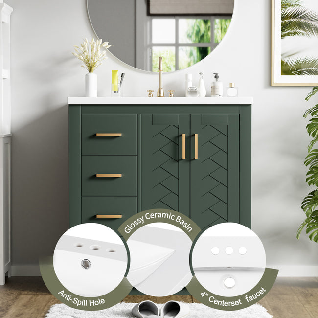 30 Inch Bathroom Vanity with Ceramic Sink Combo, Solid Wood Frame Bathroom Storage Cabinet, Freestanding Vanity Set with 3 Drawers and Soft Closing Doors, Green