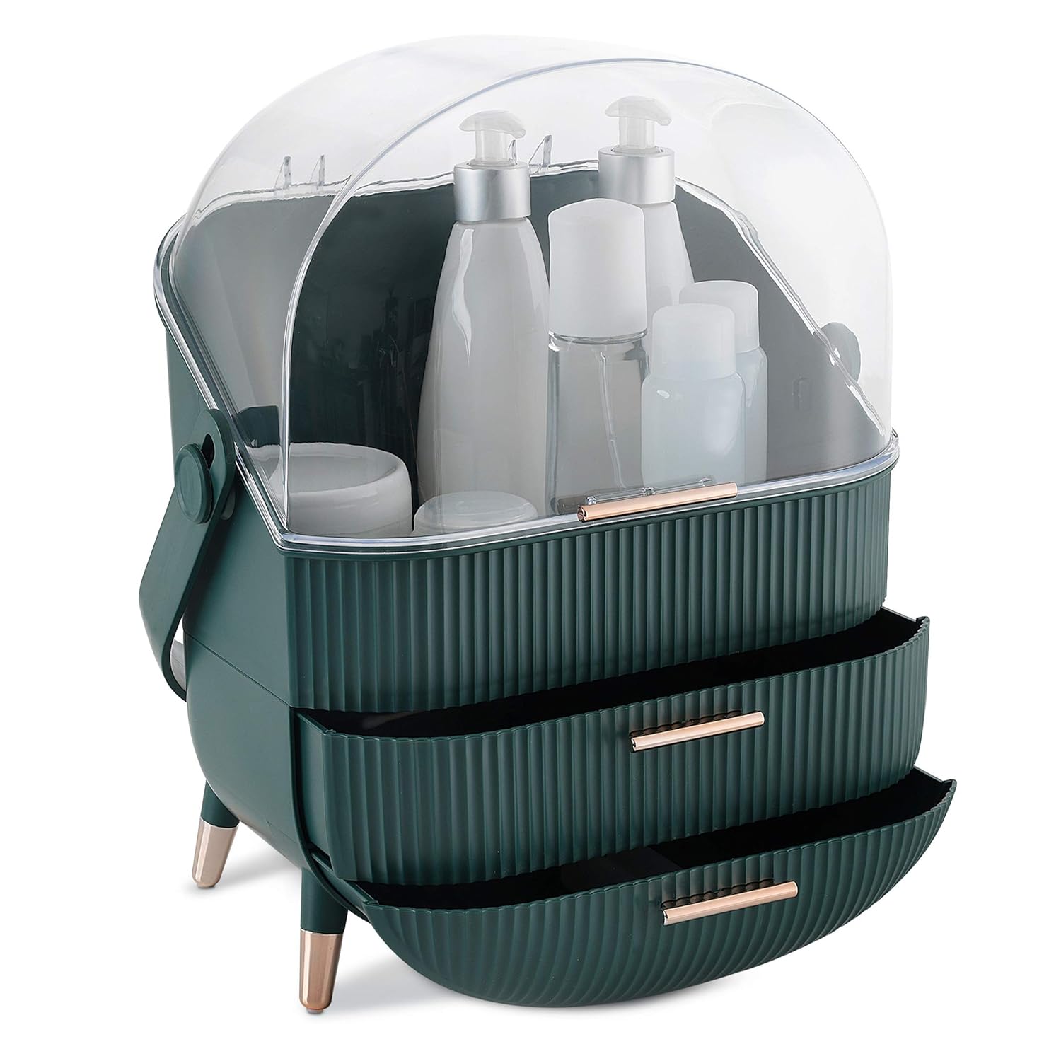 Makeup Organizer Storage Box - Cosmetics, Skincare and Beauty Case with Clear Lid Display and 2 Drawers - Bathroom Counter or Vanity - Green